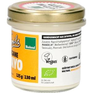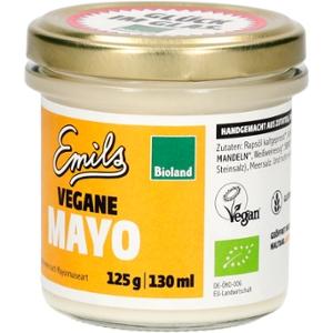 Emils Ei-freie und vegane Mayo (Bioland) im 130 ml GlasLeichte, frische, vegane Alternative zu herkömmlicher Mayonnaise da nur 55% Fett. Schmeckt zu Pommes aber auch zu Gemüse oder Kartoffelsalat.Besonderheiten:Unpasteurisiert, Vegan, Glutenfrei, Lactosefrei, null Zusatzstoffe. Bioland zertifiziert.Herstellung;Mit Liebe und in Handarbeit hergestellt in Deutschland.
