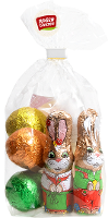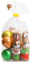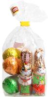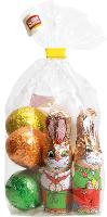 Osterhasen und bunte Ostereier in kindgerecht gestaltetem Stanniolpapier verpackt, 62,5g