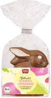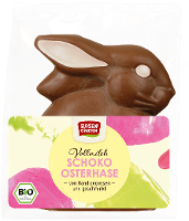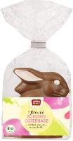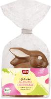 Sitzender Osterhase aus bester Bio-Vollmilchschokolade, liebevoll von Hand mit weißer Schokolade verziert.