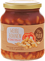 Weiße Bohnen* 50%, Tomaten* (aus Konzentrat) 38 %, Wasser, Agavendicksaft*, Meersalz, Zwiebelpulver*, Pfeffer* schwarz, Knoblauch*, Oregano*, Basilikum*.