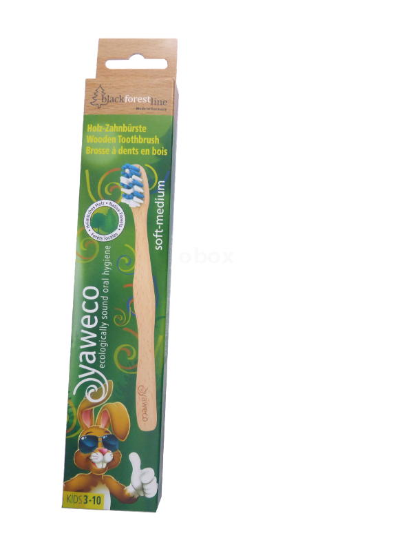 Nachhaltige Holz-Zahnbürste der yaweco Black Forest Line für Kinder, hergestellt in Deutschland. Der Holzgriff besteht aus einem nachwachsenden Rohstoff: Buchenholz aus heimischem Wäldern aus FSC-zertifiziertem Holz aus Europa. Die Holz-Zahnbürste wird aus einem Stück Holz hergestellt, jede Zahnbürste ist ein Unikat. Der Bürstengriff ist 100% kompostierbar und vegan. Die Nylonborsten P.A. 10.10 sind erdölfrei und enthalen Rizinusöl. Die Holz-Zahnbürste ist erhältlich in soft-medium in verschiedenen Borstenfarben: Weiß-Blau und Weiß-Beere.