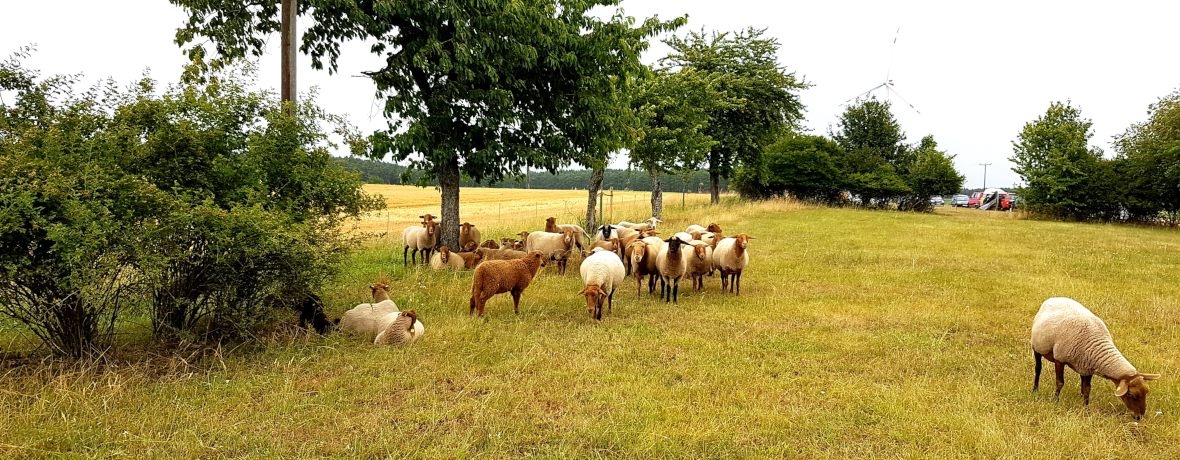 Die Herde von ca. 30 Mutterschafen besteht größtenteils aus Coburger Fuchsschafen und einigen Heidschnucken. Verfüttert wird ausschließlich hofeigenes Futter, bestehend aus Gras, Heu und Grascops. Auf Kraftfutter wird komplett verzichtet.
