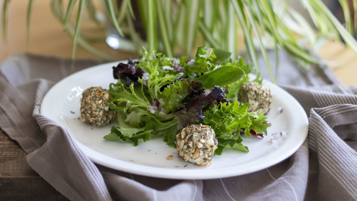 Diese wunderbaren Ziegenfeta-Bällchen sind im Handumdrehen gemacht und eine Bereicherung für jedes Buffet. Als Panade verwenden wir getrocknete Blüten. Ihr könnt hier aber kreativ werden.