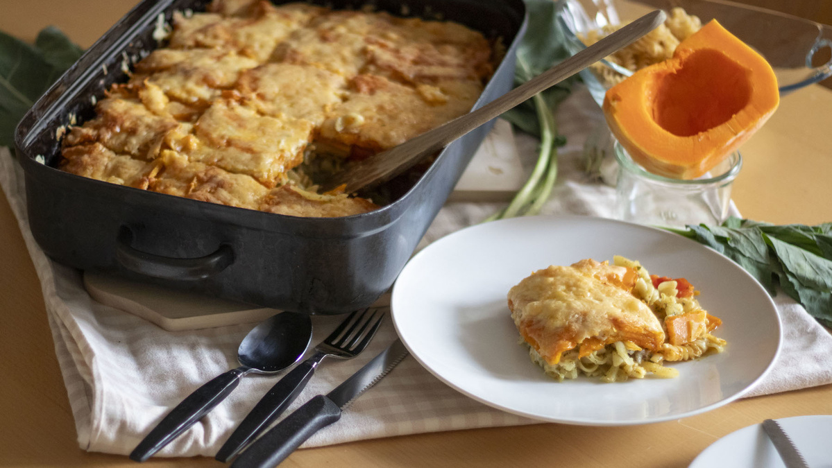 Butternutkürbis schälen und in etwa 1-2 mm dicke Scheiben schneiden. Mit den restlichen Gewürzen, etwas Salz und Öl ordentlich vermengen und auf den Nudeln ausbreiten. Reibekäse darüber geben und eine halbe Stunde bei 200 Grad mit Backpapier oder Alufolie abgedeckt im Ofen bei Umluft backen. Dann das Backpapier oder die Alufolie entfernen und eine weitere halbe Stunde bei 165 Grad Umluft fertig backen.