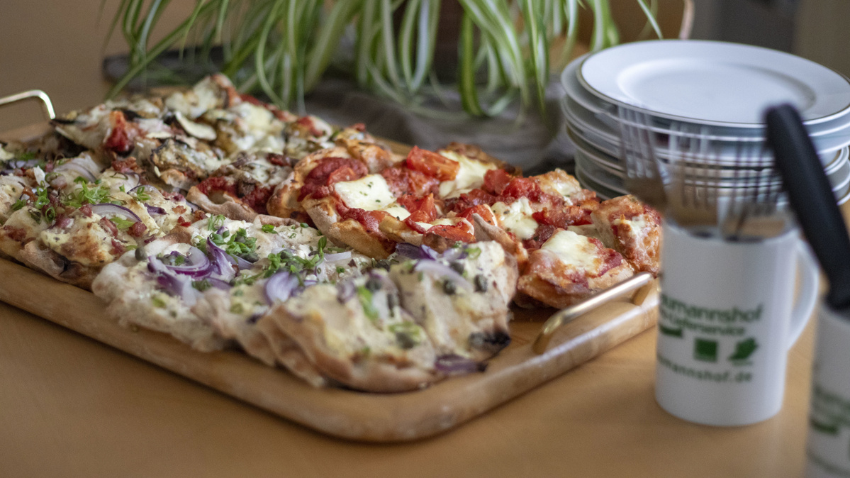 Zwiebel schälen und schneiden. Für die helle Sauce Schmand und Creme Fraiche mit Salz, Muskat und Pizza und Pasta Gewürz vermengen. 2 Pinsen mit der hellen Sauce bestreichen und darauf Zwiebel und Speck verteilen.