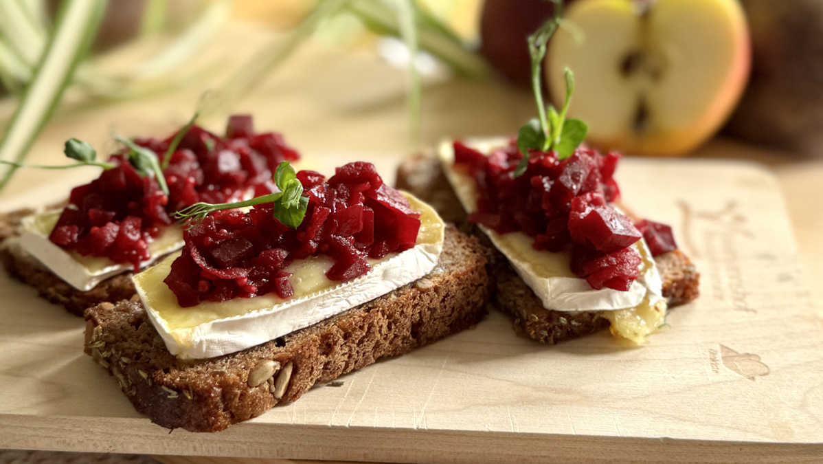 Rote Bete ist so vielseitig, sie funktioniert sogar als Tartar. Haskapbalsam bringt eine säuerliche tiefe, Apfel und Traube eine angenehme Süße. Es kann als Fingerfood serviert werden. Darunter passt auch gut ein erdiger Hummus oder wie hier angeschmolzener Camembert oder ein anderer kräftiger Käse.