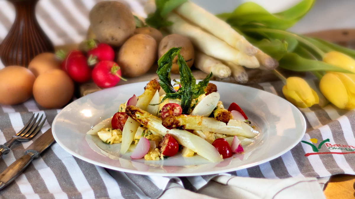 Die schönen Spargelspitzen anlegen, mit frittiertem Bärlauch und geschmorten Radieschen dekorieren und genießen!
