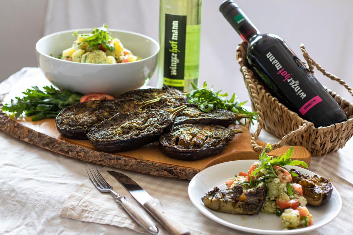 Aubergine, die schmeckt, ist eine Kunst. Ohne weitere geschmackliche Zuneigung schmeckt die Eierfrucht eher langweilig und banal. Deswegen greifen wir zu einer kraftvollen Marinade, lassen sie über Nacht ziehen und geben dem Nachtschattengewächs dann Zeit in Ruhe im Ofen zu garen. So ist das Fruchtfleisch durch und durch mit Geschmack durchtränkt und die aus Indien stammende Frucht wird zu einem echten Leckerbissen. Auch als kalte Antipasti geeignet.