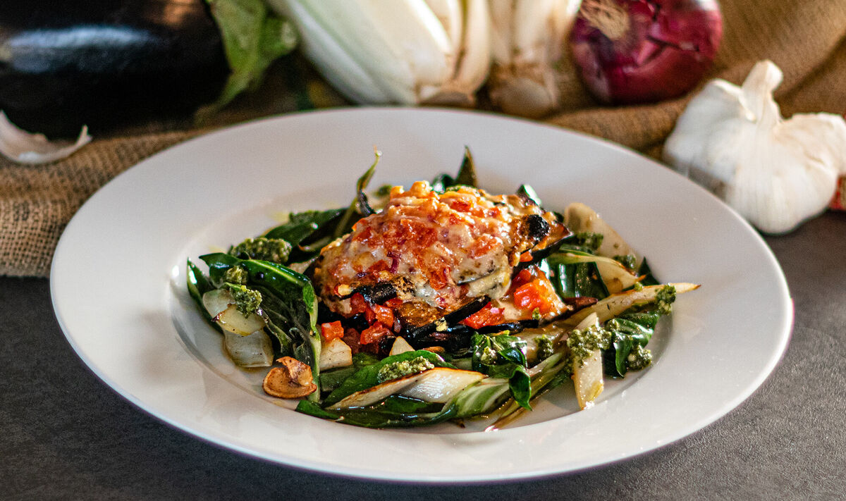 Für diese zu den Tomaten fein gewürfelte rote Zwiebel und gehackte Petersilie geben. Mit reichlich Olivenöl, Salz, Pfeffer und etwas Zucker abschmecken. Die Mischung wird nasser, wenn sie steht. Das ist okay, die Aubergine freut sich später über extra Flüssigkeit. Beim Mangold den grünen Teil des Blattes vom weißen Stiel trennen. Blattgrün etwa Daumengroß schneiden/zupfen, Stiel etwa fingerspitzengroß schneiden. Knoblauch in Scheiben schneiden.