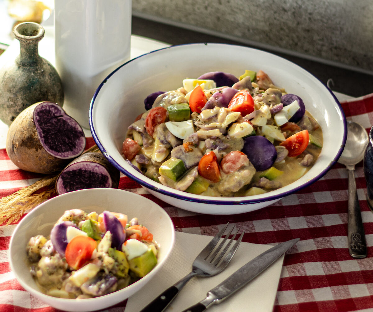 Avocados halbieren, Kern entfernen, mit einem Löffel das Fleisch herauslösen, oder, wenn sie noch sehr hart sind mit dem Sparschäler schälen, und in fingerkuppengroße Stücke schneiden. In einer Schüssel mit dem Saft der Limette vorsichtig vermengen. Die Kartoffeln mit Schale dämpfen. Wenn sie gar sind mit kaltem Wasser abspülen und schälen. In Scheiben schneiden und zur Avocado geben.