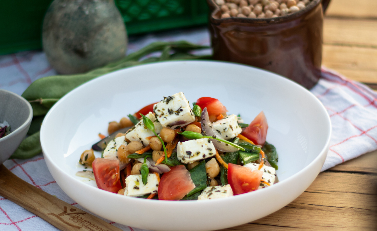 Zuerst die grünen Bohnen mit den Karotten in reichlich Olivenöl auf halber Hitze anbraten. Bereits hier etwas salzen. Nach 5 Minuten die abgetropften Kichererbsen und rote Zwiebel dazu geben. Salz und Pfeffer dazu geben. Weitere 5 Minuten unter gelegentlichem Schwenken weitergaren.