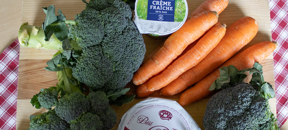 Den Brokkoli waschen, in Röschen und Stängel zerteilen. Die Stängel schälen und klein würfeln. Die Möhren schälen und in kleine Stücke schneiden. Die Gemüsebrühe aufkochen, Möhren, Brokkolistängel und Röschen darin 10 Min. kochen. Inzwischen den Brie und das Brot würfeln. Wenn Möhren und Brokkoli gar sind, einige Röschen und einige Möhrenstückchen herausnehmen. Alles mit dem Pürierstab pürieren, kurz aufkochen lassen und die Crème fraîche unterziehen. Die Suppe nicht mehr kochen lassen. Den Brie dazugeben, schmelzen lassen und mit den Gewürzen abschmecken. Die Brokkoliröschen und die Möhrenstückchen zugeben und warmhalten. Die Brotwürfel in der Butter bräunen und zu der Suppe reichen.