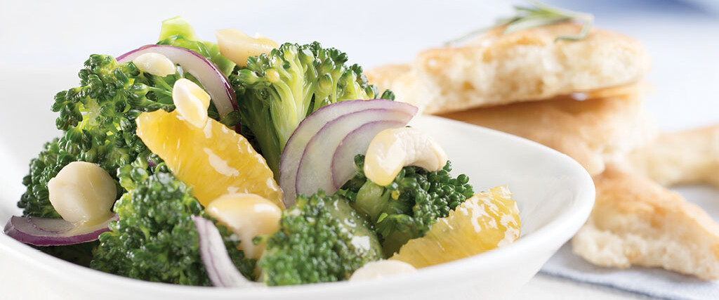 Den Brokkoli kurz blanchieren und in Röschen teilen oder wenn er roh verwendet werden soll, sehr fein schneiden. Eine Orange filetieren und aus den anderen beiden Saft auspressen. Die Nüsse grob zerkleinern und in einer Pfanne anrösten. Die Zwiebel in feine Streifen schneiden. Orangensaft, Zitronensaft und –abrieb, Honig und Leinöl miteinander verrühren, mit Salz und Pfeffer würzen. Das Dressing locker mit dem Brokkoli, den Orangenfilets, Zwiebeln und Nüssen vermengen.
