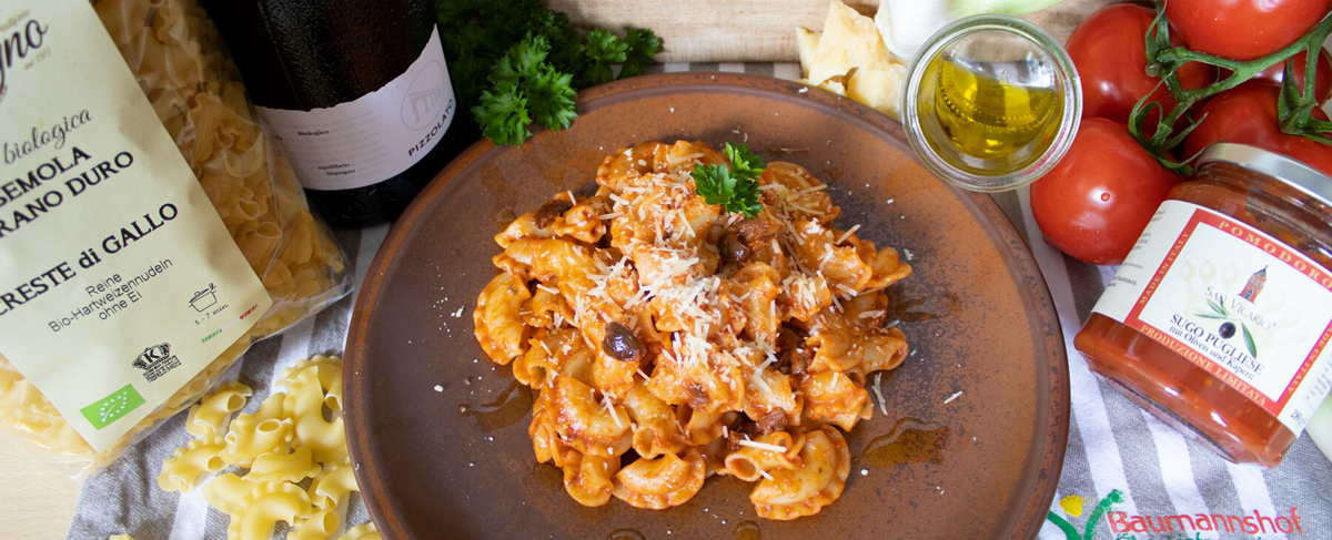 Das Nudelkochwasser mit Salz würzen, sodass es leicht salzig schmeckt. Die Nudeln dazugeben und so lange kochen, dass sie noch einen leichten Biss haben. Abgießen und dabei etwas vom Nudelwasser auffangen. Die Pasta sofort in die Pfanne zur Soße geben, gut darin verrühren und die Hitze etwas erhöhen. Unter gelegentlichem Rühren können die Nudeln sich so richtig mit der Soße verbinden. Nach ein paar Minuten den Parmesan dazugeben, einen Schluck vom Nudelwasser angießen und erneut gut umrühren. Wenn alles etwas zu trocken wirkt, noch ein wenig vom aufgefangenen Nudelwasser angießen. Die Pfanne vom Herd nehmen und um die Säure der Oliven und Kapern abzurunden, alles mit etwas Olivenöl beträufeln und vermengen. Am besten sofort servieren. Wer es mächtiger will, kann noch mehr geriebenen Parmesan darauf streuen, wer etwas Frische bevorzugt gibt gehackte Petersilie darauf. Gemeinsam mit einem schönen Glas Pinot Nero oder einem sprudeligen Zitronen-Basilikum-Wasser lässt sich das Aufkommen von Urlaubsgefühlen wohl kaum vermeiden.