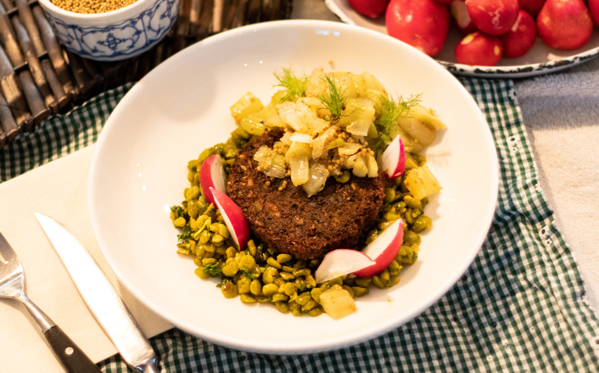 Damit muss man nicht unbedingt einen Burger bauen. Beim Grillen sind mir reichlich leckere Salate sowieso lieber. Die grünen Schälerbsen, welche mit hochwertigem Curry und Olivenöl abgeschmeckt sind, passen hervorragend zu dem süßlichen, im Ofen geschmorten Gemüse. Inmitten davon präsentiert sich der knusprige Bratling und das ist ein wunderbares Gericht. Damit sind viele Vitalstoffe, Vitamine und gesunde Fette enthalten und ein schönes Essen ist - auch bei nicht Grill tauglichem Wetter - gesichert.