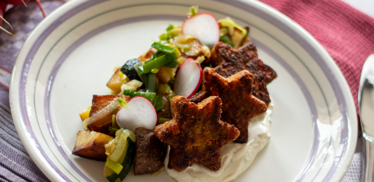 Alle Zutaten auf dem Teller anrichten. Eventuell mit etwas Radieschen dekorieren.