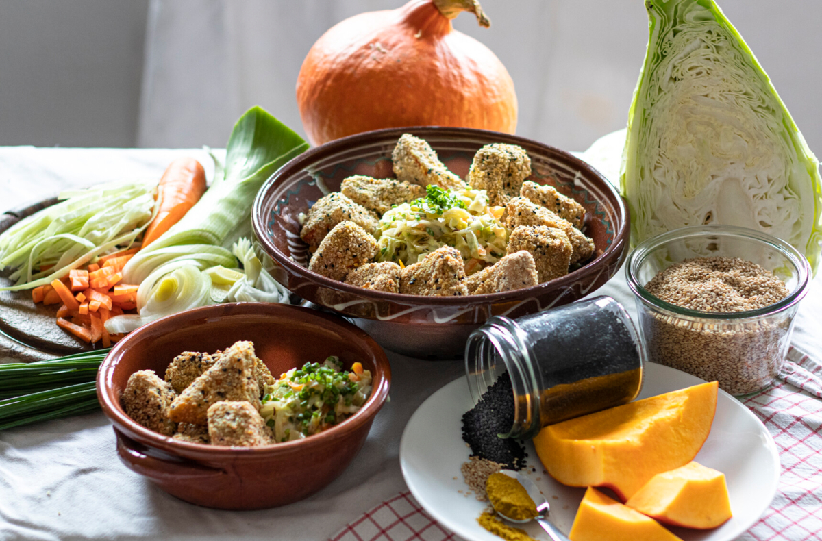 Übrigens funktionieren die Nuggets auch ohne Ei. Dieses kann etwa mit Zuckerrübensirup ersetzt oder die Kürbisstücke in einem dick angerührten Mehl Wasser Gemisch getunkt werden und direkt in der Panade gewälzt werden.
