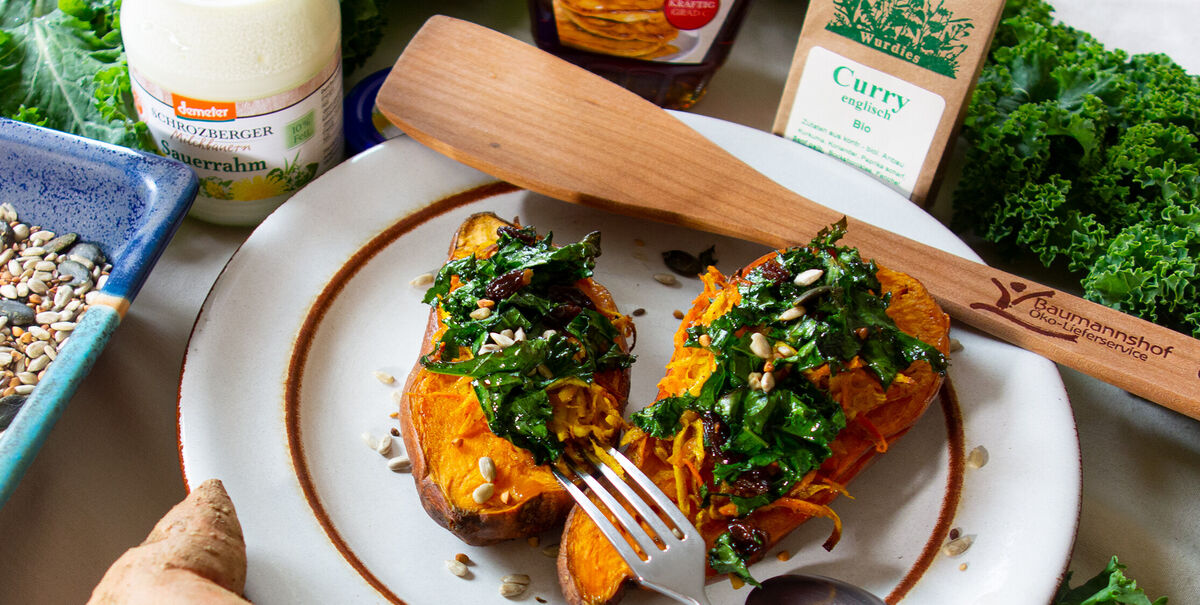 Ofen auf 180 Grad vorheizen. Sultaninen mit Ahornsirup vermengen und aufquellen lassen. Olivenöl in eine große Schüssel geben. Gemüse waschen. Süßkartoffeln längs halbieren, mit Olivenöl einreiben, leicht salzen, mit der Schnittseite nach oben auf ein mit Backpapier ausgelegtes Blech legen. 30 Min. im Ofen garen lassen. In der Zwischenzeit Möhren und Pastinake schälen, grob reiben, mit der Hälfte des übrigen Olivenöls und einem Tl englischem Curry gut vermengen. Beiseitestellen und gut durchziehen lassen. Grünkohl vom Strunk befreien und in feine Streifen schneiden. In den Rest Olivenöl die gleiche Menge Tamari Sojasoße geben, verrühren und die feinen Grünkohlblätter gut darin schwenken, mit beiseitestellen und durchziehen lassen. Nach 30 Min die Möhren-Pastinaken-Raspel mit Salz, Pfeffer abschmecken und kleine Häufchen auf die halbgaren Süßkartoffelhälften geben. Nochmal für 10 Min in den Ofen schieben. Saaten (Sesam, Kürbiskerne, Sonnenblumenkerne) trocken in einem Topf rösten. Eingeweichte Sultaninen mit dem Grünkohl mischen und als krönenden Abschluss locker auf die Möhren-Pastinaken-Raspel setzen. Noch 5 Min. bei 200 Grad rösten lassen.