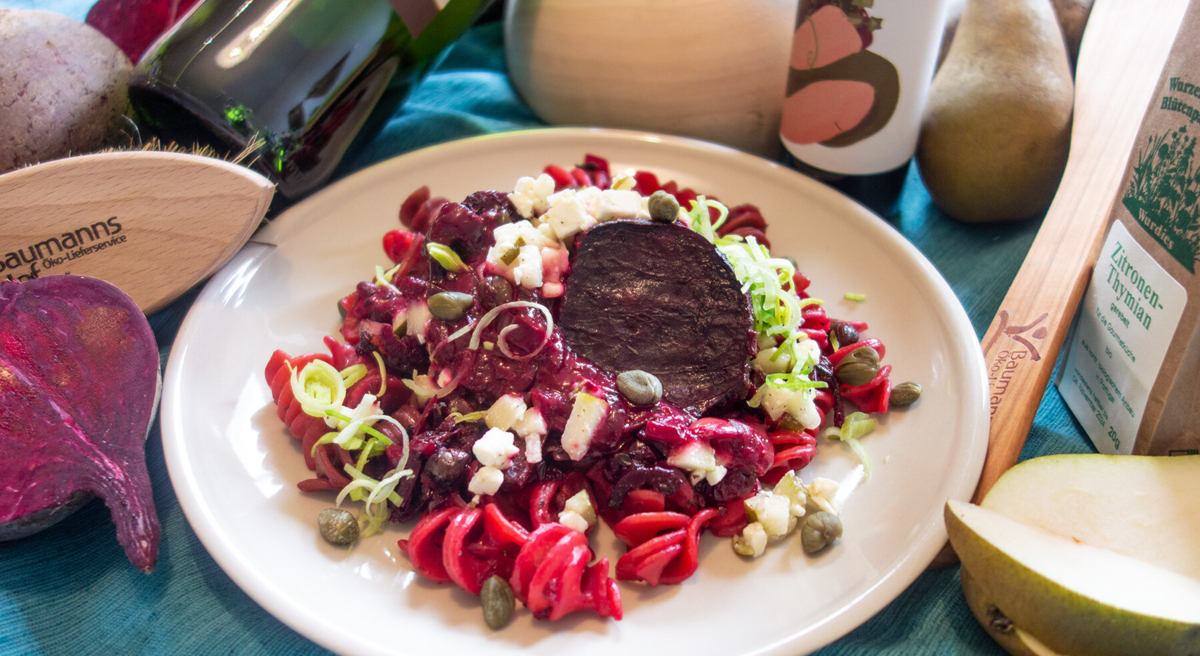 Etwa 15 Minuten bevor die Rote Bete fertig ist, Wasser für die Nudeln aufsetzen und sie nach Packungsanleitung kochen.
