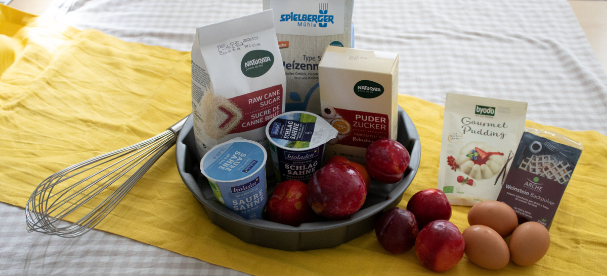Sahne mit 100 g Zucker und Vanillezucker halbsteif schlagen. Die Eier nacheinander unterrühren. Zum Schluss die Mehlmischung unterheben. Den Teig in eine gefettete Springform (26 cm) geben, die Pflaumen darauf verteilen und auf der 2. Schiene von unten ca. 10 Minuten vorbacken. Saure Sahne mit dem restlichen Zucker, Ei und dem Puddingpulver verrühren. Nach 10 Minuten Backzeit den Kuchen kurz aus dem Ofen nehmen, die Creme darauf verteilen und nochmals für ca. 40-45 Minuten backen.