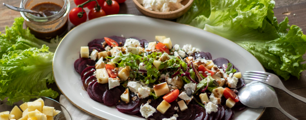 Weil wir noch wunderbare Rote Bete vom Baumannsacker im Lager haben, war dies Grund genug diesen italienischen Klassiker neu und vegetarisch zu interpretieren. Es wird sogar ein bisschen farbenfroh: zur erdigen Bete passt wunderbar die Süße der Ananas sowie die Cremigkeit eines Feta Käses. Zusammen mit einem säuerlich fruchtigen Dressing und ein bisschen bitteren Blattsalaten wird daraus ein leckerer Hingucker. Eine wunderbare Vorspeise, die nicht nur schön aussieht, sondern auch beim privaten Drei-Gänge-Menü zu punkten weiß. Oder bei einem Buffet. Oder beim Grillen. Eigentlich geht Rote Bete immer…