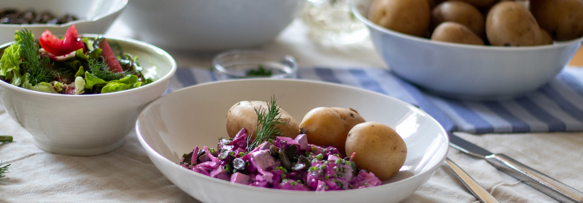 wer sagt, das Rote Bete ein Wintergemüse ist? Die vitalen, farbigen Superknollen kommen gerade frisch vom Acker und es gelüstet mich seit Tagen auf Matjes Hausfrauenart. Nun ist der vegetarische Anteil an hungrigen Mäulern am Hof recht groß, meine Lust auf eines meiner Lieblings-Kindheitsgerichte aber ungebremst. Also geht es jetzt daran, die kulinarische Brücke der salzig sauren Fisch-Variante über das Superfood Rote Bete zu schlagen. Überraschenderweise kommt die Vegi-Alternative aromatisch sehr nah an das Original heran. Hausfrauenart lässt sich also nicht nur auf Matjes anwenden.