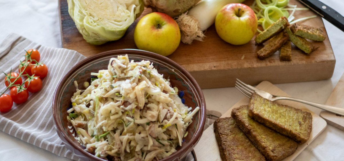 Besonders wichtig beim Grillen finde ich, sind schmackhafte Salate und Beilagen. Ein Salat, der immer geht, lecker und vitalisierend ist, ist ein Waldorfsalat. Er besteht klassisch aus Sellerie, Apfel, Lauch, Zwiebel, Walnüssen und Mayonnaise. Knollensellerie ist ein Wunderwerk an Wirkstoffen und Antioxidantien. Für den Salat kann man ihn entweder auf einer Reibe raspeln oder man schneidet ihn händisch klein. Zweiteres ist aufwändiger, macht (zumindest mir) Spaß und sieht schöner aus. Oder man bedient sich einem sogenannten Julienne-Schneider. Je nach Größe ist so eine Knolle mit Beiwerk recht ergiebig. Der Salat lässt sich, gekühlt gelagert, aber auch zwei Tage später noch gut essen. Vielleicht ist er dann sogar ein bisschen besser ;)