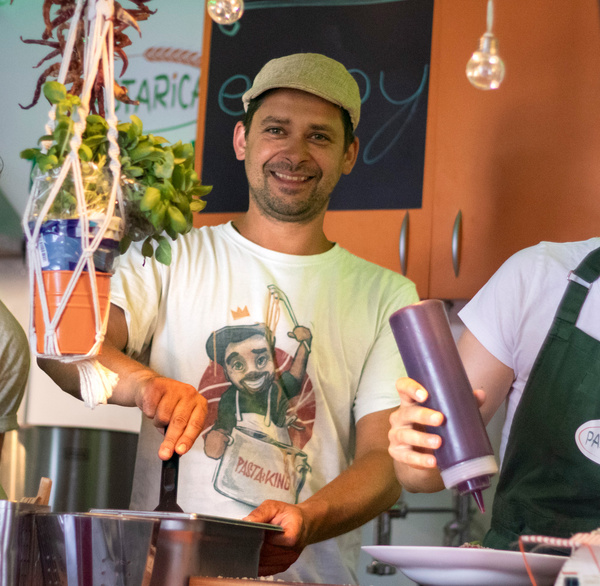 Neben vegetarisch/veganen Köstlichkeiten von grün4 und gourmettauglicher Gasthausküche vom Landgasthof Fetz gab es auch komplett frisch gekochte Pasta im „Food Court“. In der Pastarica vom lieben Sebastian wird die Pasta per eigener Nudelmaschine aus lokalem Hartweizengries und Wasser direkt im Food Trailer frisch hergestellt, gekocht und mit diversen, selbst zubereiteten Saucen serviert. Der Baumannshof steuerte Wildkräuter und Lauch bei. Natürlich alles in Bio-Qualität und mit Liebe!
